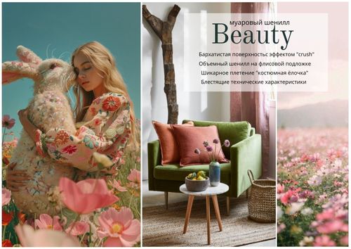 Коллекция Beauty – это невероятный по своей красоте муаровый шенилл на флисовой подложке. Здесь прекрасна каждая деталь: невероятно мягкая, бархатистая с матовым переливом муаровая поверхность, сглаженный «crush» эффект, шикарное плетение отсылающее к образам Шанель, и конечно, цветовая гамма. Палитра коллекции включает как сложные классические, так и мягкие цветочные оттенки, здесь легко найти цвета пека и морской пены, оттенки морских ракушек и сосновых лесов лазурного берега, и конечно классические оттенки ночного неба, терракоты, шоколада с яркой ноткой лайма и мяты.